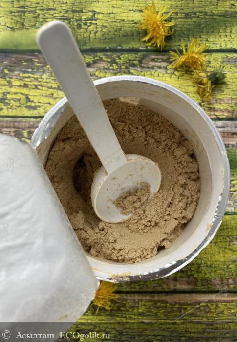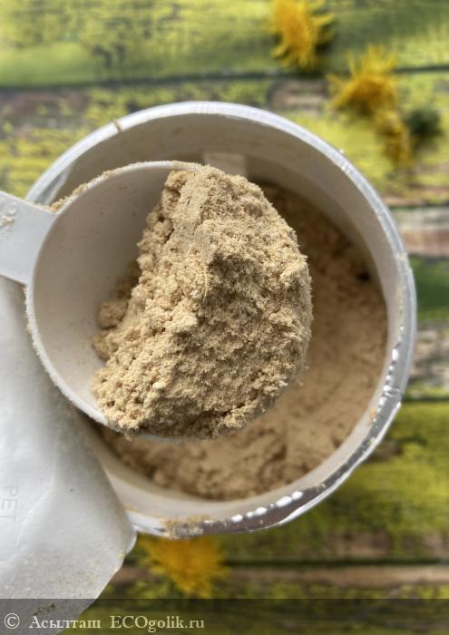 Есть травяной привкус, не приторный. Весит 200 грамм. Добавляю в йогурт, каши и творог.Вообще, можно в любые блюда добавить. Я добавляю 2 раза в день по 2 ложки, нет после неё тяжести и боли в желудке, легкость.