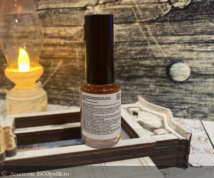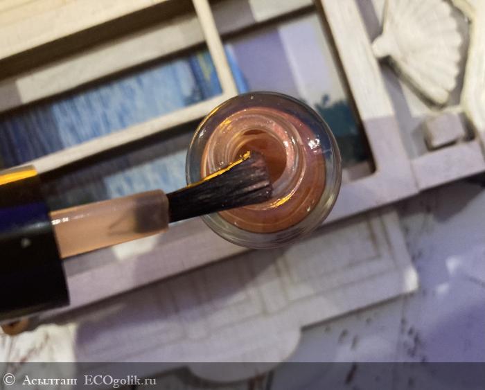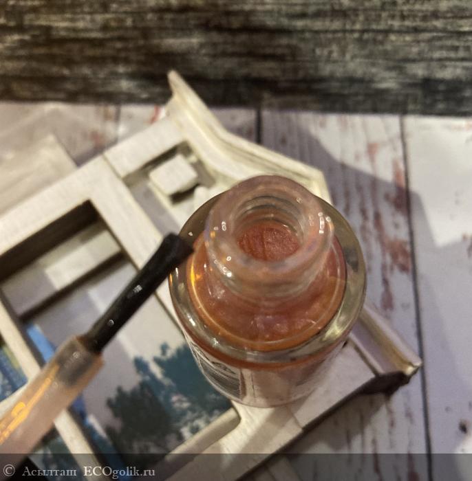 Находясь во флакончике лак выпадает в осадок, а сверху образуется оранжеватая жидкость.