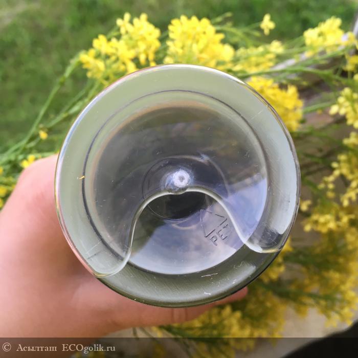 Флакон прозрачным по бокам зеленая наклейка с данными об изделии. Она матовая.