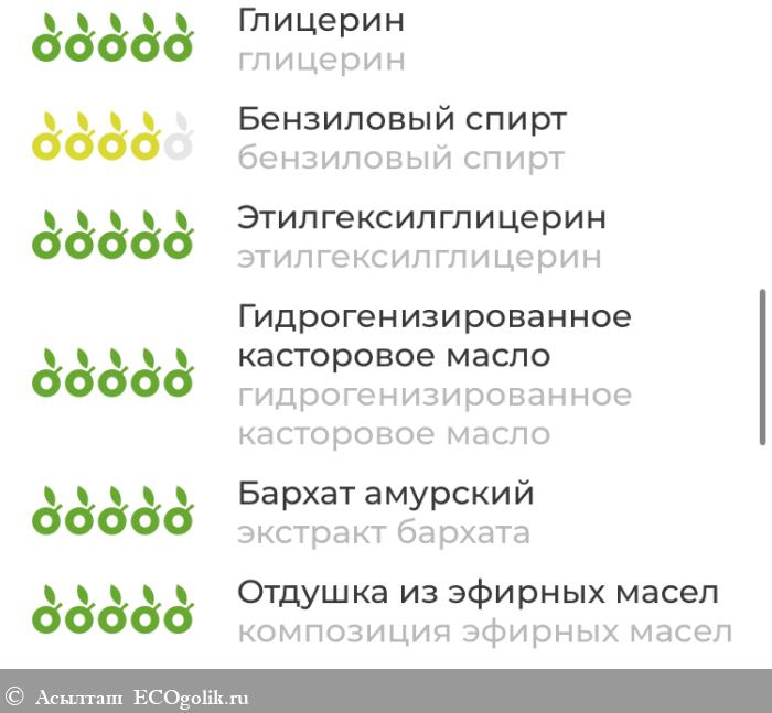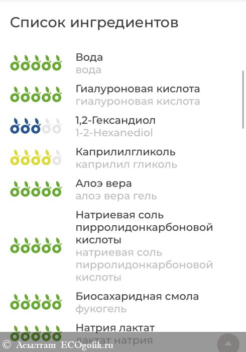 вода, гиалуроновая кислота, 1,2-гександиол, каприлил гликоль, алоэ вера гель, натриевая соль пирролидонкарбоновой кислоты, пентиленкликоль, фукогель, лактат натрия, глицерин, бензиловый спирт, этилгексилглицерин, гидрогенизированное касторовое масло, экстракт бархата, композиция эфирных масел.