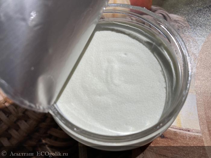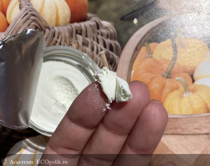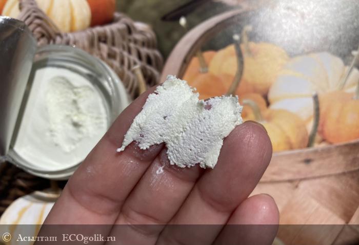 Текстура - густая в виде рыхлой пасты. Чисто белого оттенка. Пахнет свежими мятными оттенками.
