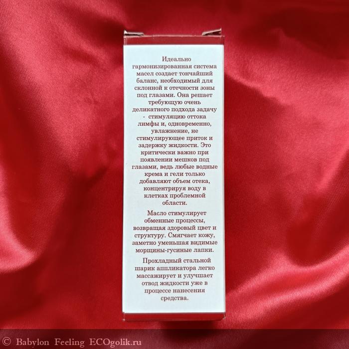 Легчайшее масло для контура глаз заинтересовало меня, в первую очередь, большим количеством масел в составе, а во-вторых - наличием шарикового аппликатора для массажа кожи во время нанесения средства.
