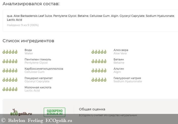 Aqua (Вода), Aloe Barbadensis Leaf Juice (Алоэ вера гель), Pentylene Glycol (Растительный пентиленгликоль), Betaine (Бетаин), Cellulose Gum (Гелеобразователь), Algin (Гелеобразователь), Glyceryl Caprylate (Растительный эмолент), Sodium Hyaluronate (Гиалуронат), Lactic Acid (Молочная кислота).