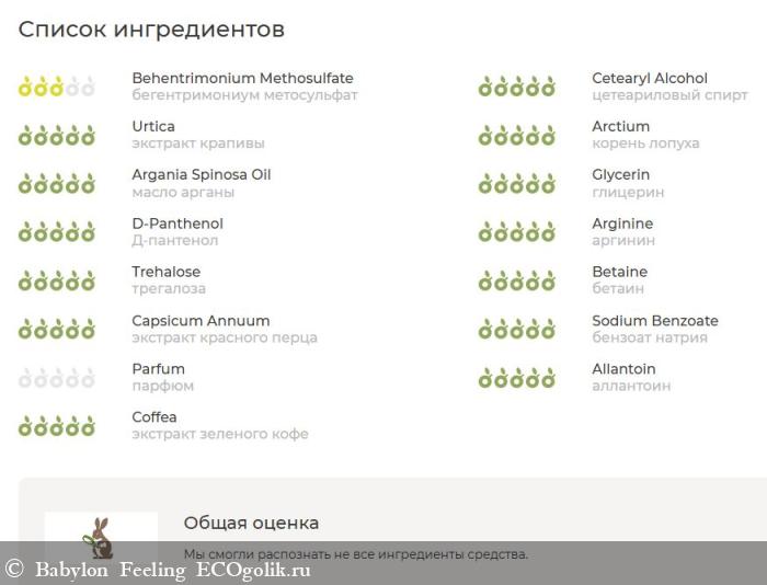 Гидролат крапивы, бегентримониум метосульфат, цетеариловый спирт, масляный экстракт крапивы, масло корня лопуха, масло арганы, глицерин, Д-пантенол, гидрованс, аргинин, трегалоза, бетаин, экстракт красного перца, бензоат натрия, парфюм, аллантоин, экстракт зеленого кофе
