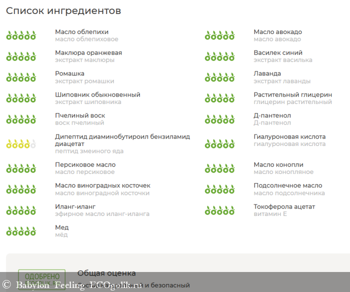 Состав одобрен Экоголиком, все компоненты имеют натуральное происхождение.