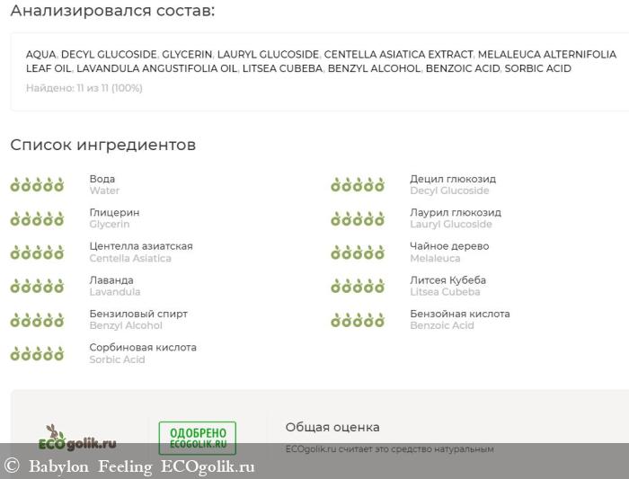 ВОДА, ДЕЦИЛ ГЛЮКОЗИД, ГЛИЦЕРИН, ЛАУРИЛ ГЛЮКОЗИД, ЭКСТРАКТ ЦЕНТЕЛЛЫ, ЭФИРНОЕ МАСЛО ЧАЙНОГО ДЕРЕВА, ЭФИРНОЕ МАСЛО ЛАВАНДЫ, ЭФИРНОЕ МАСЛО ЛИТСЕИ КУБЕБЫ (ВЕРБЕНЫ ТРОПИЧЕСКОЙ), БЕНЗИЛОВЫЙ СПИРТ, БЕНЗОЙНАЯ КИСЛОТА, СОРБИНОВАЯ КИСЛОТА