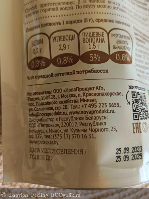 В продукте содержится большое количество пищевых волокон, нет кофеина и глютена.