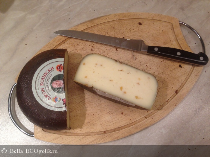 Сыр твердый, но режется без усилий. Цвет имеет традиционный, в сыре видны семена пажитника. А какой у него вкус! Он насыщенный, много такого сыра не съешь, он сытный. Вкусный сыр, который запоминается надолго!