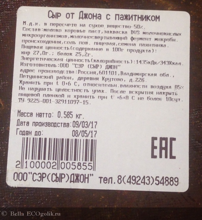 Я покупаю сыр Джона Кописки рядом с домом в магазине экотоваров Три Земли. Пока пробовала только сыр с пажитником, который и хочу вам показать. Головка сыра весит 585 г. Его продают кругляшками, не режут, не фасуют. В родной упаковке сыр достаточно хорошо хранится, в магазине он находится в холодильнике. Срок годности (с этикетки) 2 месяца.