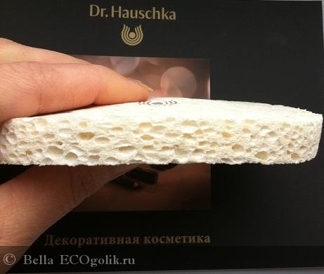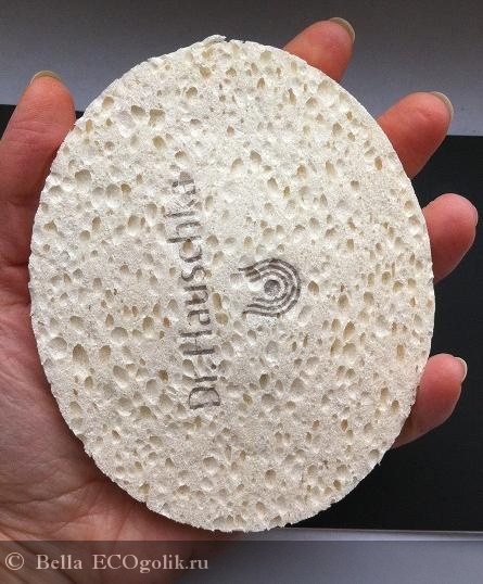 Спонж Dr.Hauschka– это натуральный спонж из целлюлозы. Он просто огромный, когда намокает! У меня не умещается в ладони. Др.Хаушка рекомендует использовать спонж для удаления глиняной маски для лица. Для этого нужно обильно смочить спонж водой и прижимающими движениями пройтись им по лицу. После того, как глиняная маска размокнет, ее нужно смыть водой руками. Просто умываться этим спонжем я бы не советовала, поскольку для этих целей он грубоват. После использования спонжа я его стираю натуральным мылом. Сейчас у меня жидкое мыло Олива-персик Sodasan. После кладу на деревянную мыльницу для просушки.