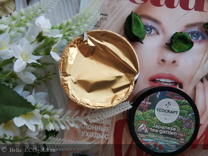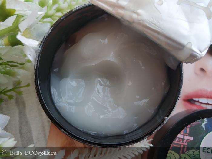 Маска находится в небольшой круглой банке из темного пластика с отвинчивающейся крышкой. Меня привлекает дизайн марки ECOCRAFT, эта маска не исключение. Логотип и название продукта утопают в зеленых садах Японии. Я смотрю на нее, и уже хочу оказаться в этом благословенном месте!