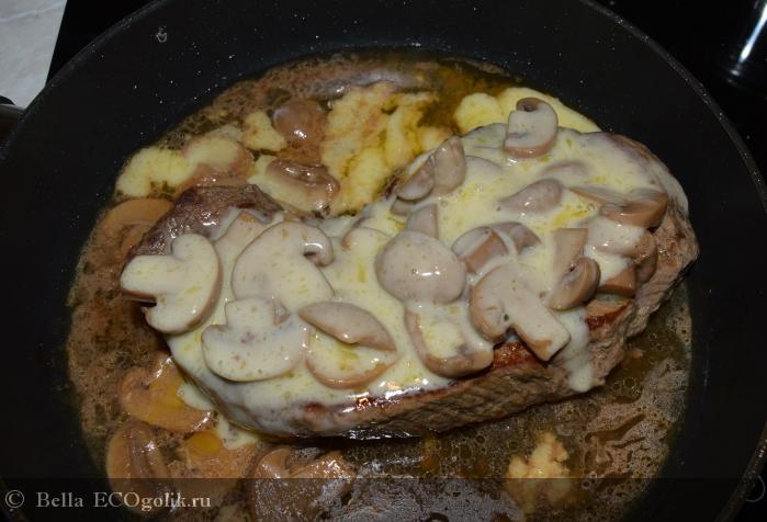 Нарезаем шампиньоны, обжариваем их и кладем на говядину