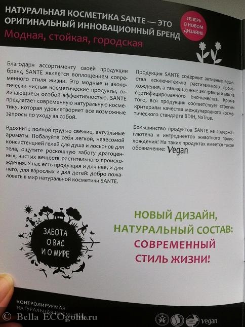 При покупке крема я получила симпатичную глянцевую брошюру, в которой описаны принципы работы марки Sante и ее продукция, но об этом я расскажу в отдельном посте. Для затравочки покажу одну страничку из этой брошюры: