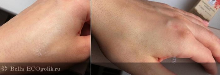 На руке хорошо видно, как крем впитывается. Он впитывается не мгновенно, пока его наносишь, видны белые круги на коже.
