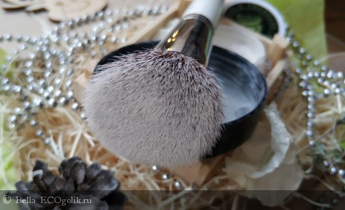 Лучше всего использовать кисть кабуки. У меня она с плоским срезом. Я много лет ею пользуюсь, мне удобно. Насыпаем порошок в крышку.