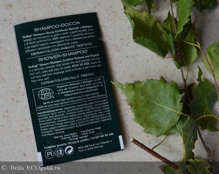 Второй шампунь, который я недавно попробовала, принадлежит другой итальянской марке BIOKAP. И это не простой шампунь, а средство 2 в 1! Это одновременно и шампунь и гель для душа. Он мне достался в пробнике при заказе в ИМ Эковиль. А поскольку мой основной шампунь закончился, я решила не откладывать пробники в дальний угол, а начала активно их использовать!
