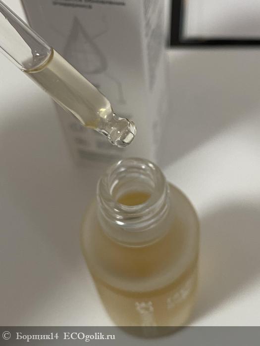 Сама сыворотка желтого цвета, имеет лёгкую текстуру, жидкая, но с небольшим намеком на маслянистость, который не ощущается после распределения по коже. Запах никакой не почувствовала.