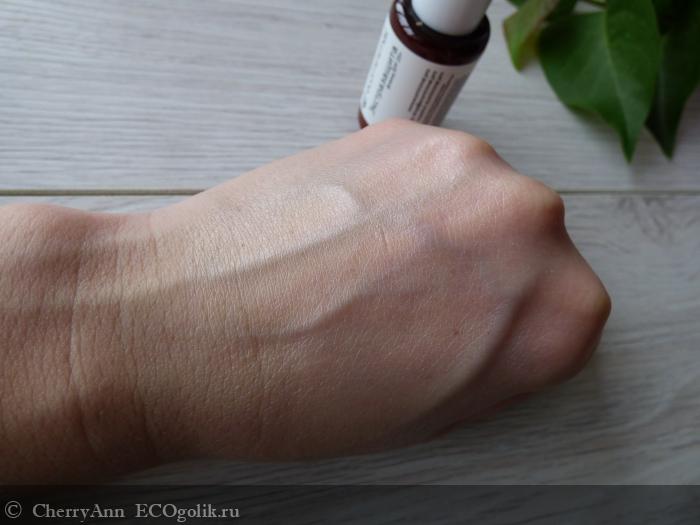 Флюид имеет ярко выраженный запах, который ощущается в первые минуты нанесения. Спустя минут 5-10 я уже не ощущаю его. Это травяной запах, у меня почему-то ассоциации с полынью или лекарственными травами. На мой взгляд, немного специфичен, но он быстро выветривается, поэтому не успевает надоесть.