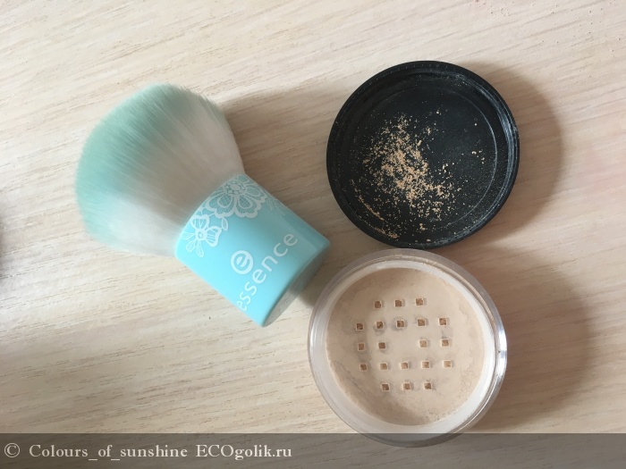 Пудра рассыпчатая, мелкого помола. Аромат у неё еле уловимый, нейтральный. Я наношу ее так: немного насыпаю в крышку от пудры, собираю ее кистью кабуки от Essence и наношу на лицо. Я наношу ее на голое лицо после того, как впитается увлажняющий крем для лица. Базой для макияжа и тональным/bb/cc кремом не пользуюсь. Для того, чтобы ее наносить, нужно приноровиться, особенно тем, кто, как я, раньше пользовался только компактными пудрами.
