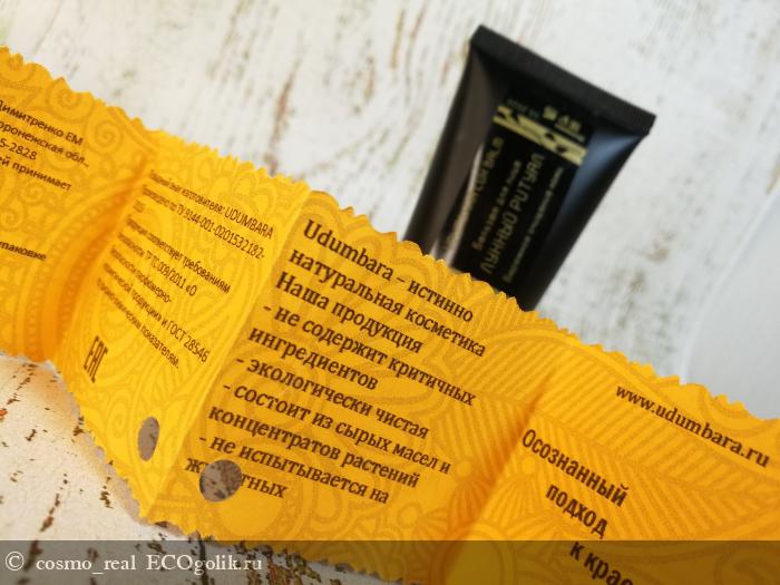 Хотя она вроде бы кажется и простой. Но это же Udumbara, даже простая черная туба может смотреться шикарно! На тубе мило подвязан вкладыш с подробной и всей необходимой информацией о средстве.