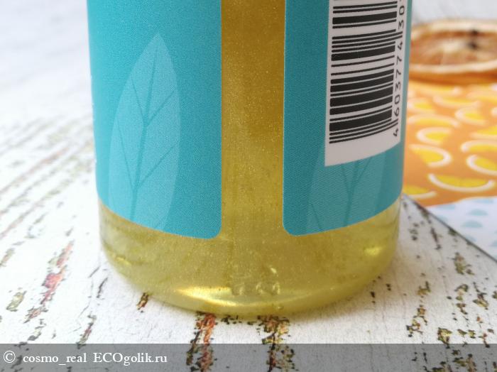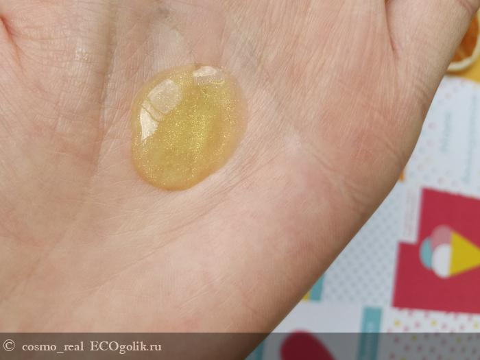 Консистенция гелевая, имеет желтый оттенок и веселые блестки, выглядит прикольно