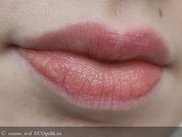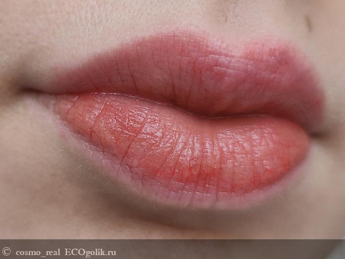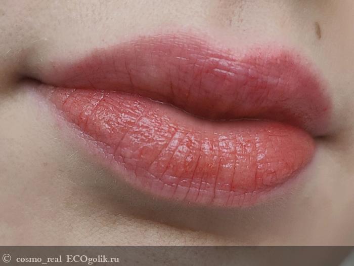 Консистенция бальзама умеренно плотная, но при этом он легко скользит по губам, равномерно распределяется и не создает ощущения липкости или тяжести. На губах бальзам смотрится красиво: один легкий слой придает им соблазнительный оттенок, напоминающий о поцелуе.