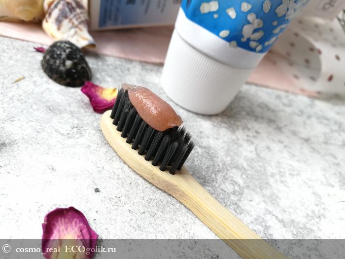 Текстура у пасты очень интересная - гелевая, имеет легкий розовато-коричневатый оттенок с легким мятным ароматом; ощущаются крупинки соли. Она сочетает в себе низкий индекс абразивности и выраженные свойства по устранению налёта.