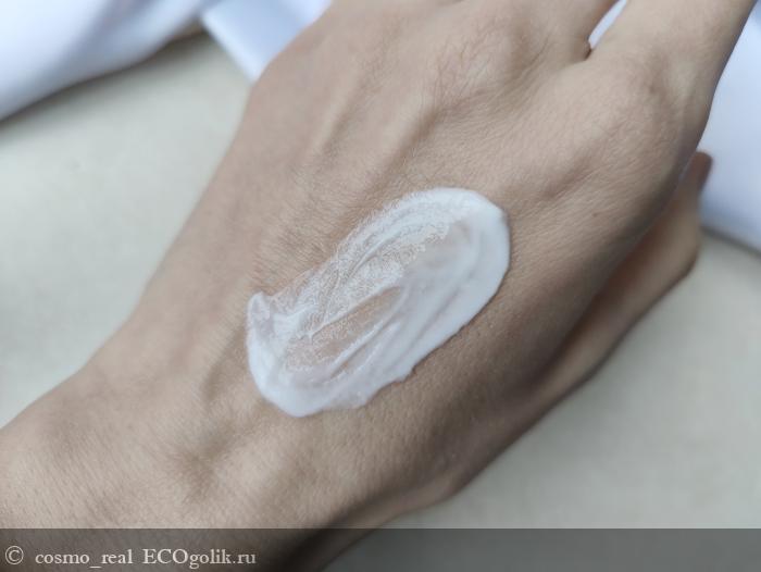 Консистенция крема стандартная кремовая, не слишком плотная или жирная, но и не легкая флюидная. Он прекрасно распределяется по коже и практически сразу впитывается, не оставляя неприятных ощущений.