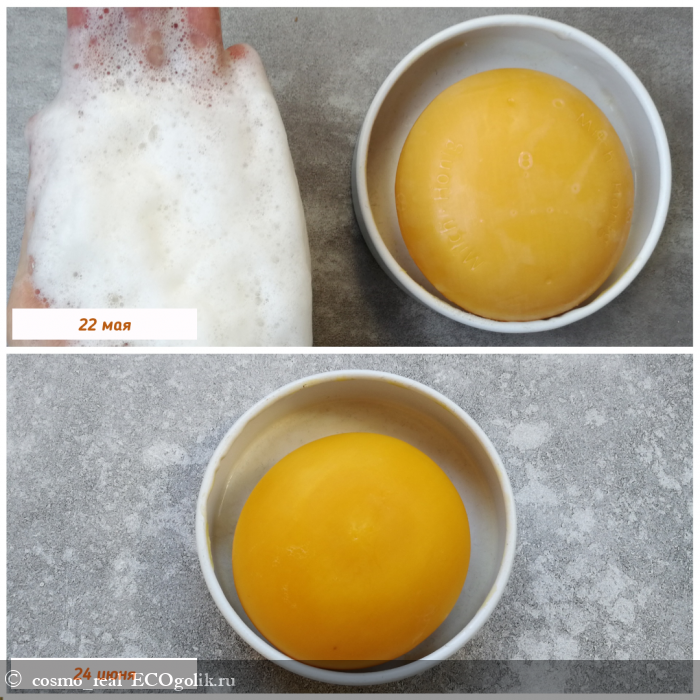 Объема 200 гр хватит на очень долго. Мы с мужем используем его каждый день и я не знаю, способно ли оно закончиться! На фото ниже, если присмотреться к форме, можно увидеть, что мыло приплюснулось за время использования и чуть уменьшилось все-таки в диаметре. Муж просит каждый раз затариться этим мылом наперед