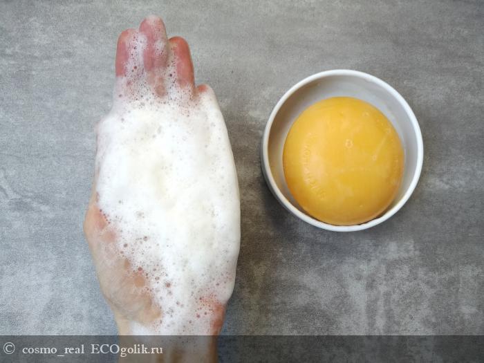 Цвет - насыщенный желтый, но не пугайтесь, в составе мыла нет синтетических ароматизаторов или красителей.