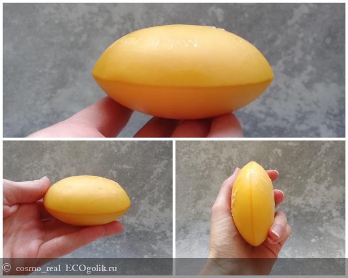 Только посмотрите, какой же красивый брусочек - идеально гладкий, ровный, увесистный такой, тяжеленький, солнечный и такой жизнерадостный. Не припоминаю, чтобы у меня было такое круглое мыло и такое идеальное