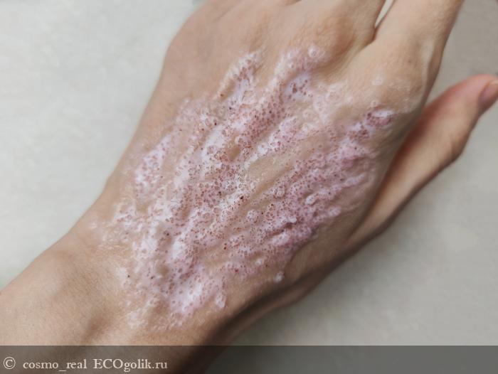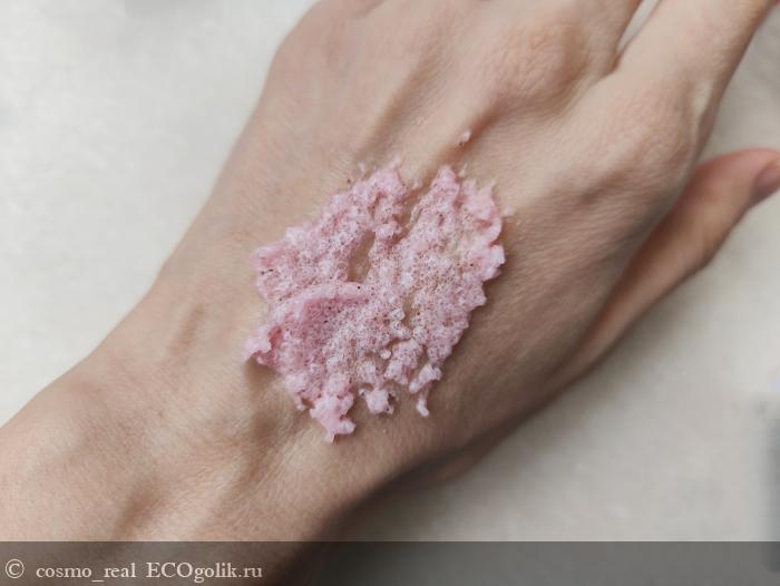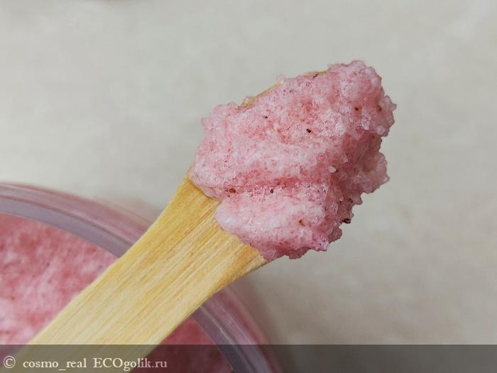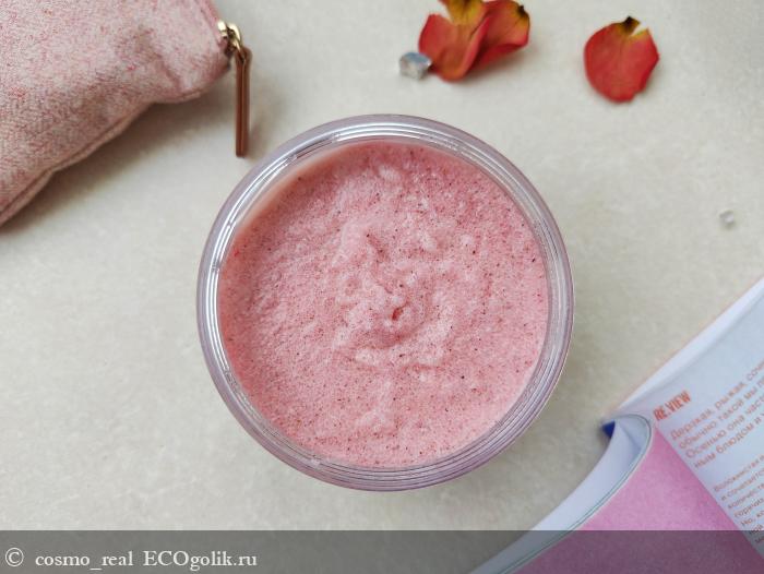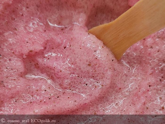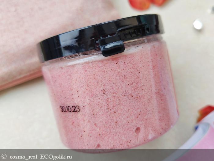 Консистенция у скраба обалденная: нежное клубничное сорбе с мелкими гранулами сахара и скорлупы фундука. Выглядит аппетитно!