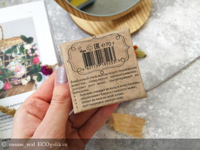 Шампунь находится в такой красивой крафтовой упаковке, вот она вроде бы простая, но мне безумно нравится. На ней полностью указан состав, срок годности, дата изготовления и немного информации о бамбуковом угле, который содержится в этом шампуне.