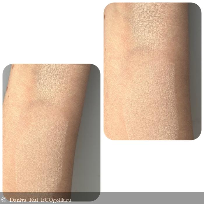Сверху - свотч нанесен пальцем, снизу - спонжем. Покрытие спонжем получается вполне натуральным и естественным.