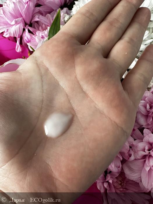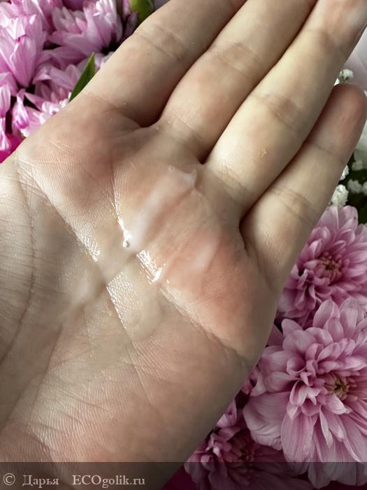 Сам гель молочного цвета и приятно пахнет парфюмированной отдушкой. Мне почему то слышится миндаль . По консистенции имеет вязкость,такое желеобразное ,но быстро мылится с помощью воды.