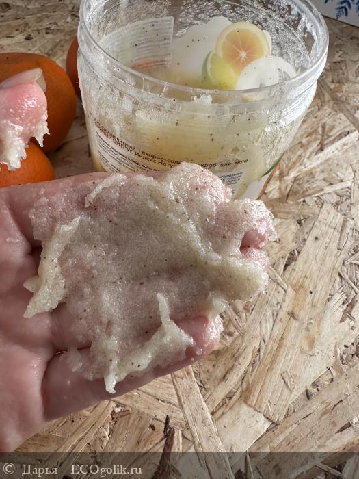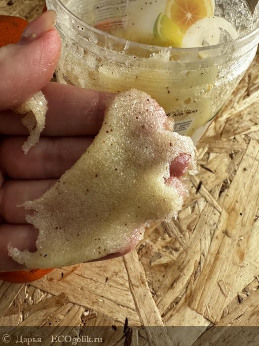Скраб для меня оказался идеальной консистенции. Достаточно густой, но при этом тягучий, не крошится, не разваливается, не сыпется. Очень удобно распределять его по коже. При этом ванная останется чистой.