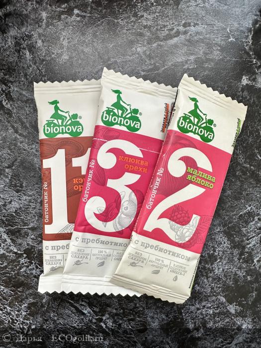 Всем привет! Не так давно, после того как набрала 6 лишних килограмм, решила пересмотреть свой рацион питания. Пришлось отказаться от конфет, булочек, пирожных, хотя я сладкоежка до мозга костей. Отказаться от сладкого совсем стало невыносимо, решила найти этому полезную альтернативу. Выбор пал на бренд бионова. Все натурально. Взяла на пробу фруктовые батончики разных вкусов.