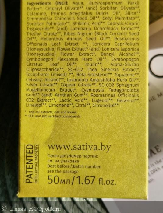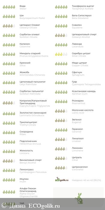 Состав: Вода, масло ши*, цетеарил оливат**, сорбитан оливат**, каламин, масло сладкого миндаля*, силика**, масло жожоба**, цетил пальмитат**, сорбитан пальмитат**, шикимовая кислота**, каприлик/каприк триглицерид**, экстракт ламинарии золотистой**, триэтилцитрат**, масло смородины черной**, масло семян подсолнечника**, экстракт листьев розмарина**, экстракт жимолости*, бензиловый спирт**, эфирное масло лемонграсса**, эфирное масло листьев лемонграсса*, инулин**, альфа-глюкан олигосахарид**, экстракт листьев зеленого чая*, комплекс токоферолов*, бета-ситостерол*, сквален**, цетеариловый спирт**, эфирное масло лаванды**, цитрат серебра**, цитрат меди**, экстракт сфагнума*, гуаровая камедь**, ксантановая камедь**, экстракт розмарина**, молочная кислота**, эвгенол**, гераниол**, линалоол**, лимонен**, цитраль**, цитронеллол**. * натуральные экстракты, масла и воски, **компоненты с ECO и BIO сертификатами.