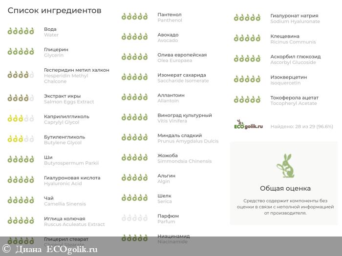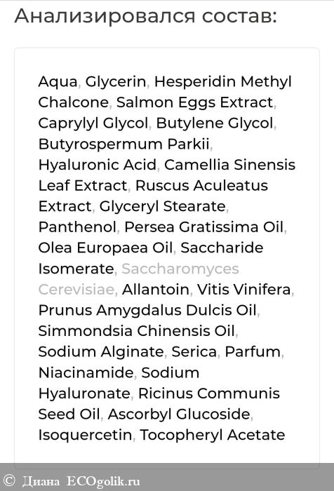 Состав: Aqua, Glycerin, Hesperidin Methyl Chalcone, Salmon Eggs Extract, Caprylyl Glycol, Butylene Glycol, Butyrospermum Parkii, Hyaluronic Acid, Camellia Sinensis (Green Tea) Leaf Extract, Ruscus Aculeatus Extract, Glyceryl Stearate, Panthenol, Persea Gratissima (Avocado) Oil, Olea Europaea (Olive) Oil, Saccharide Isomerate, Saccharomyces Сerevisiae, Allantoin, Vitis Vinifera, Prunus Amygdalus Dulcis Oil, Simmondsia Chinensis Oil, Sodium Alginate, Serica, Parfum, Niacinamide, Sodium Hyaluronate, Ricinus Communis Seed Oil, Ascorbyl Glucoside, Isoquercetin, Tocopheryl Acetate
