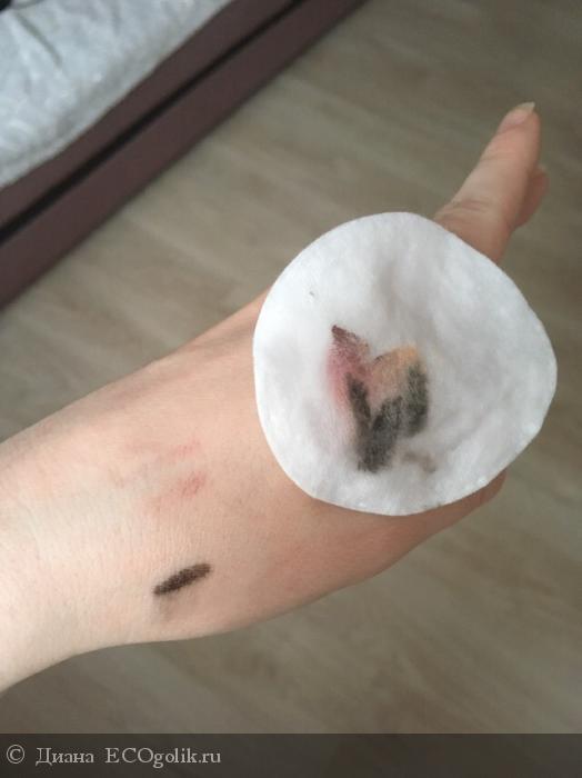 Макияж можно стереть без особых усилий, не нужно тереть. Вода очень мягко и быстро помогает убрать все средства с лица. На руке нанесено: стойкий карандаш для губ, матовая помада, консилер, подводка для глаз. Диском протерла без усилий туда и обратно.