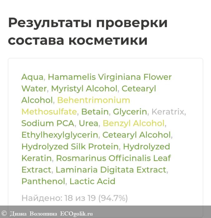 Aqua, Hamamelis Virginiana Flower Water, Myristyl Alcohol, Cetearyl Alcohol (and) Behentrimonium Methosulfate, Betain, Glycerin, Keratrix, Sodium PCA, Urea, Benzyl Alcohol, Ethylhexylglycerin, Cetearyl Alcohol, Hydrolyzed Silk Protein, Hydrolyzed Keratin, Rosmarinus Officinalis (Rosemary) Leaf Extract, Laminaria Digitata (Horsetail Kelp) Extract, Panthenol, Lactic Acid.