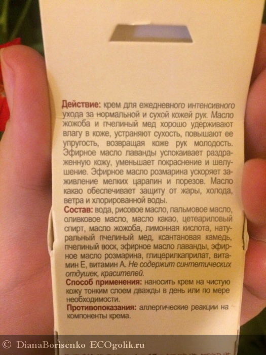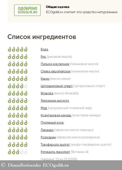 Проанализируем состав: вода, рисовое масло, пальмовое масло, оливковое масло, масло какао, цетариловый спирт, масло Жожоба, лимонная кислота, натуральный пчелиный мед, ксантовая камедь, пчелиный воск, эфирное масло лаванды, эфирное масло розмарина, альфа-токоферола ацетат (Витамин Е), Витамин А.
