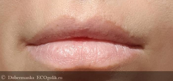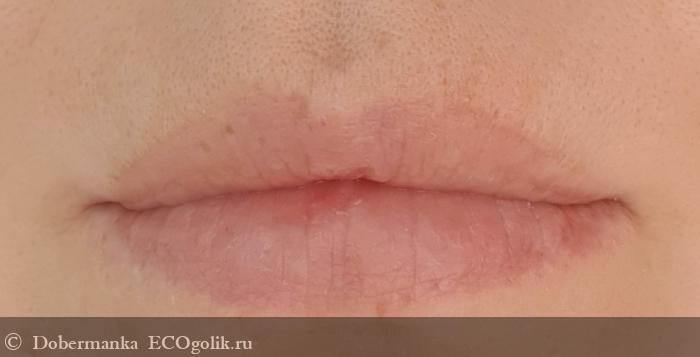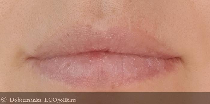 Тут бальзам нанесен очень тонким слоем, как можно ровнее, кончиком пальца. А если нанести больше - все неровности и шелушения будут заметны еще больше.