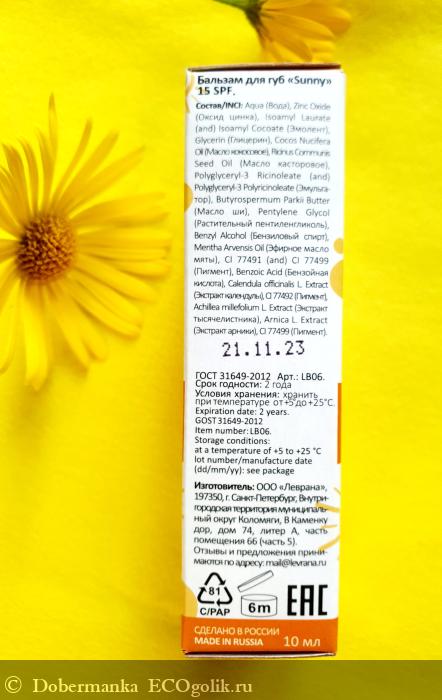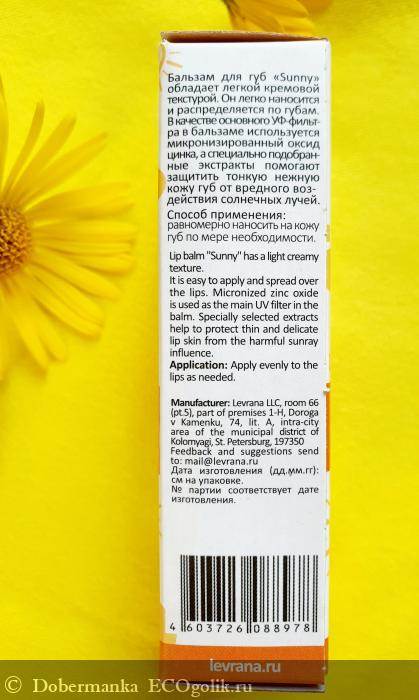 Солнцезащитный бальзам для губ "Sunny" от бренда Levrana обеспечивает хорошую защиту от вредных солнечных лучей. Крайне необходим для пляжного сезона и на отдыхе. Но в условиях города нужно контролировать слой и равномерность нанесения. Да и дополнительного питания и увлажнения от этого бальзама ждать не стоит.