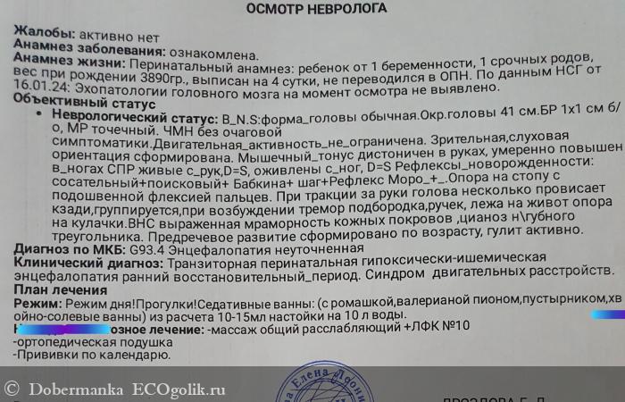 Невролог нас успокоил, сказал, что ребенок в свои два месяца развивается в пределах нормы. Есть небольшие отклонения в виде тремора подбородка, беспокойного сна и чего-то еще, но не критично, и в приеме лекарств пока не нуждается. Назначила расслабляющие ванночки (в том числе, хвойно-солевые).