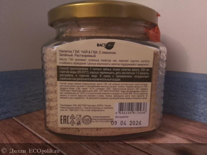 Масло ГХИ усиливает полезные свойства чая. А ещё оно помогает ощущать сытость и избегать переедания. Так что, такой чай подойдёт для тех кто хочет снизить вес. На обратной стороне баночки мы можем прочитать состав этого чая, в котором ничего плохого не наблюдается. Дата изготовления указана там же. Есть информация о производителе - это компания "ВастЭко", которая находится находятся в городе Нижний Новгород.