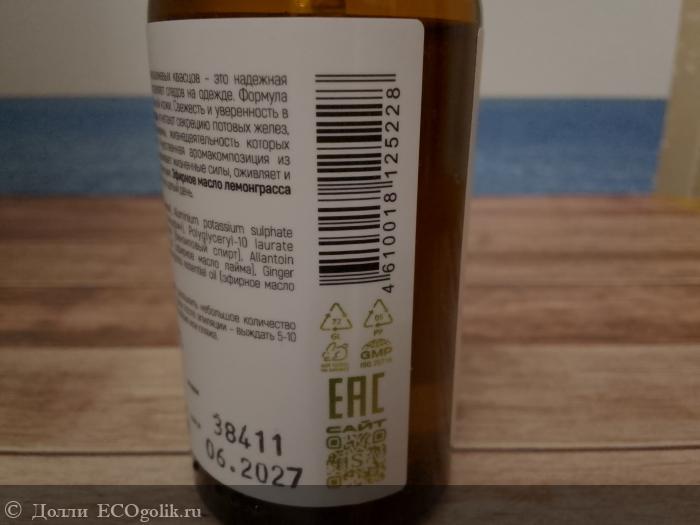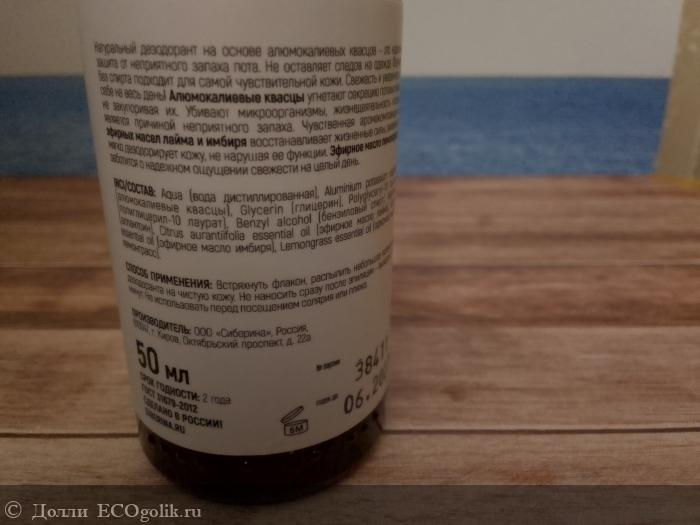 А еще флакончик очень красивый, на нем изображен лайм и кусочки имбиря. Мне понравилось, что там натуральный состав, значит, что абсолютно безопасен. В отличие от антиперспирантов, которыми я стараюсь не пользоваться, потому что они считаются вредными, у этого дезодоранта все отлично.