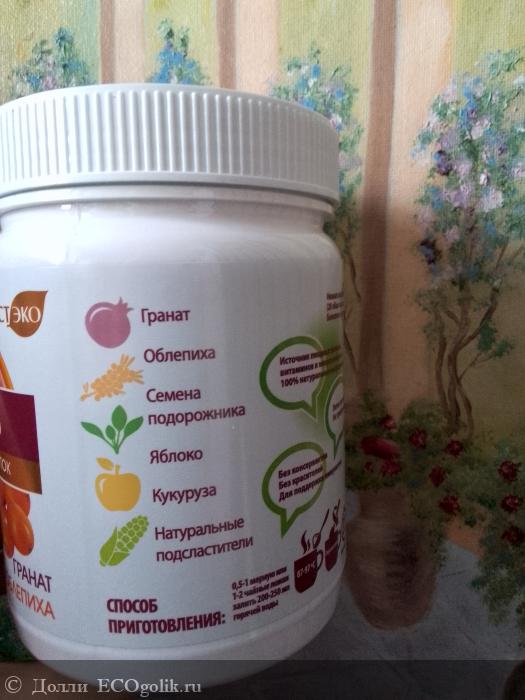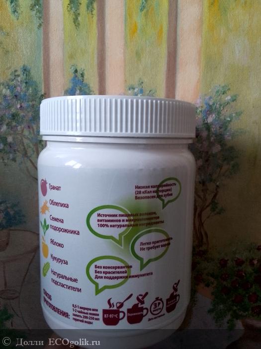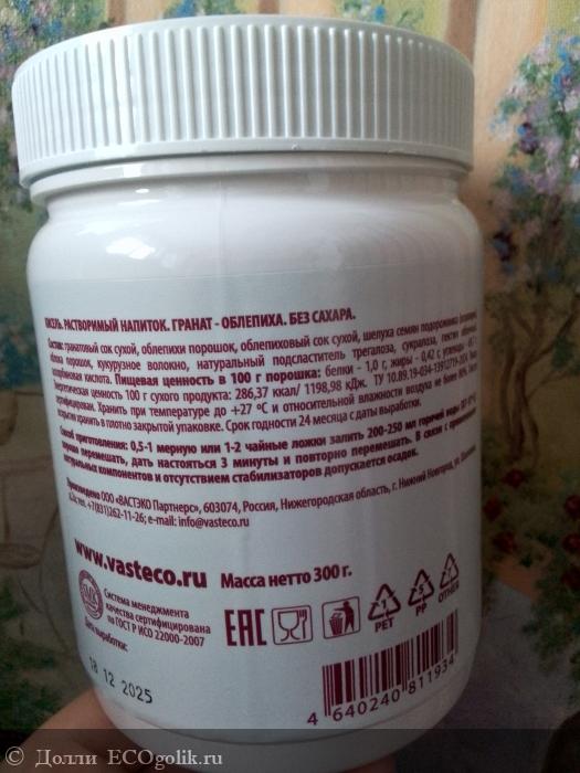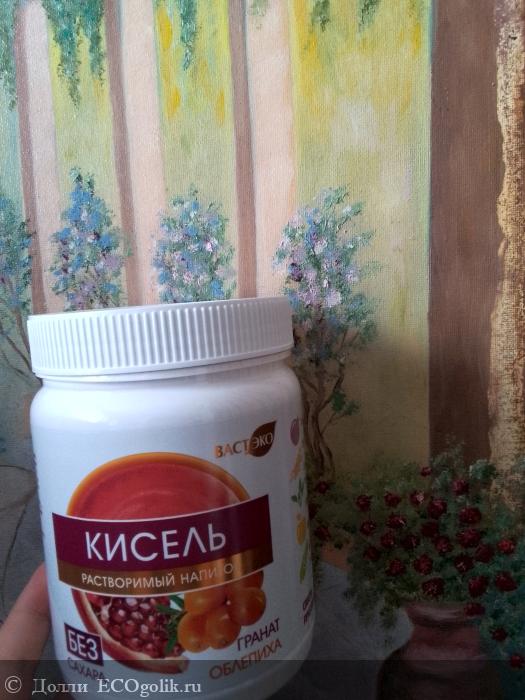 Всем привет, мои дорогие читатели! Сегодня я вам расскажу про один очень вкусный и полезный продукт, это кисель со вкусом граната и облепихи "Вастэко". Я уже давно знакома с этим производителем, у них очень много всяких полезных продуктов, которые могут помочь легко перейти на правильное питание. И вот я наконец попробовала их кисель. У них есть также и другие вкусы, например, клубника, но у меня гранат с облепихой. Он представляет собой сухую смесь, которую нужно залить горячей водой и подождать несколько минут, и всё ваш кисель готов. Сейчас мы посмотрим, как выглядит банка с этим продуктом. Она яркая и красивая, несомненно привлекает внимание, на ней мы видим изображение граната и облепихи.
