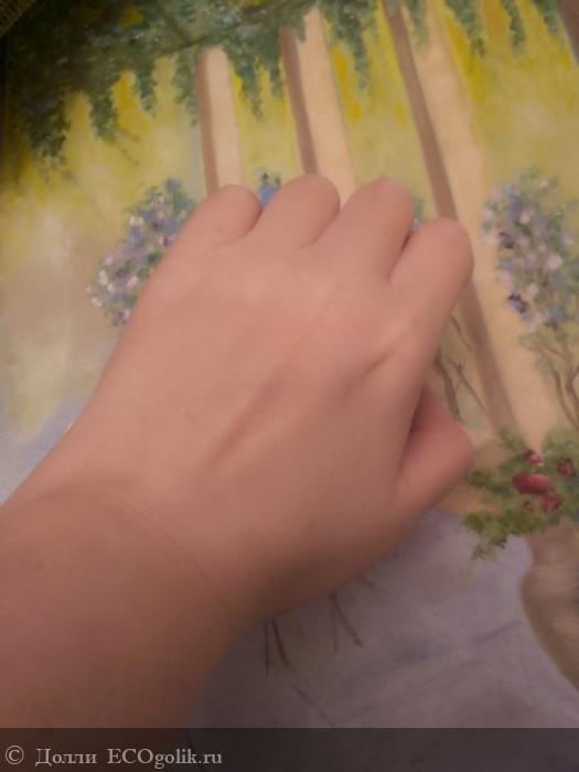 И вот я нанесла его на кожу и немного помассировала. Он быстро впитывается, но тут она еще блестит.