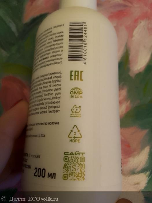 Во флакончике находится 200 мл этого молочка. Срок годности у него составляет 18 месяцев с даты изготовления. Здесь мы видим значок кролика, который помогает нам понять, что средства не тестируются на животных.
